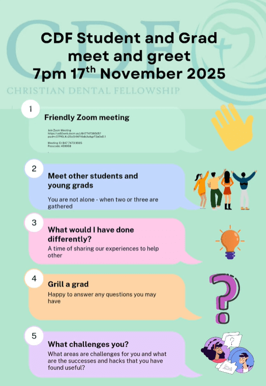 Come and join us as we meet together to catch up, discuss the trials and joys of being dental mums and to pray for each other. You’re welcome whether you’re in active dental work or not. If you’d like more information please contact Cathy Fordyce via cdfadmin@cdf-uk.org