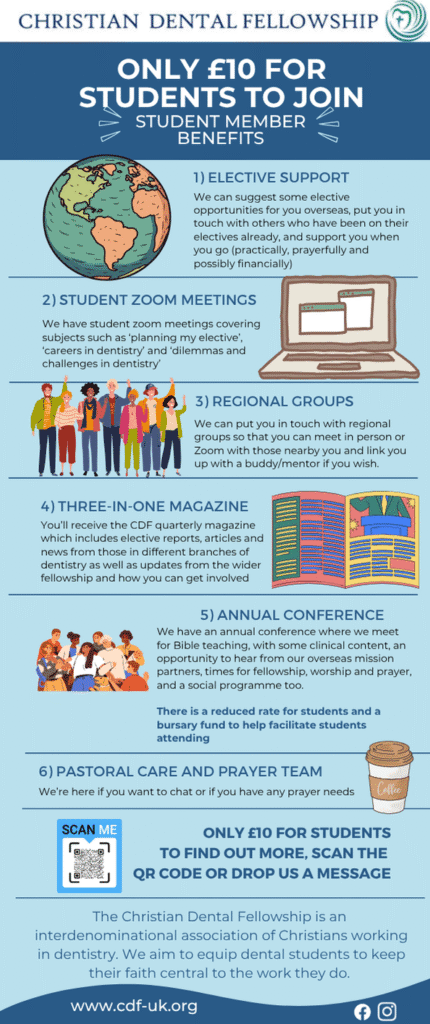 CDF holds Zoom meetings specifically for students, where we can connect Christian dental students with students at other Dental Schools, and we hold themed Zoomed events on subjects relevant to students. We can put students in touch locally with our regional groups that meet together socially, for fellowship and prayer, and here students will find peer and pastoral support.